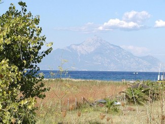 Sithonia. Z Sarti widać zatem, z odległości około 40 km, półwysep Athos, z dominującą